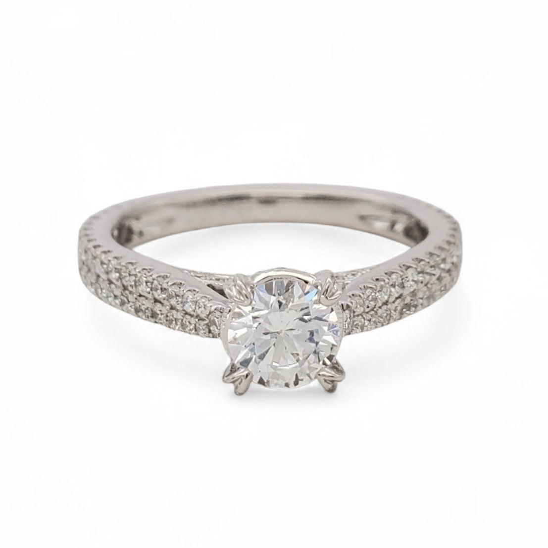 Elegant diamond semi-mount crafted in 18 karat white gold, designed for a round center stone. The cathedral-style shank is accented with 0.51 carat total weight of round brilliant diamonds, graded F color and SI1 clarity, adding exceptional sparkle and sophisticaton to this timeless setting. *CZ center, desired center stone sold separately.