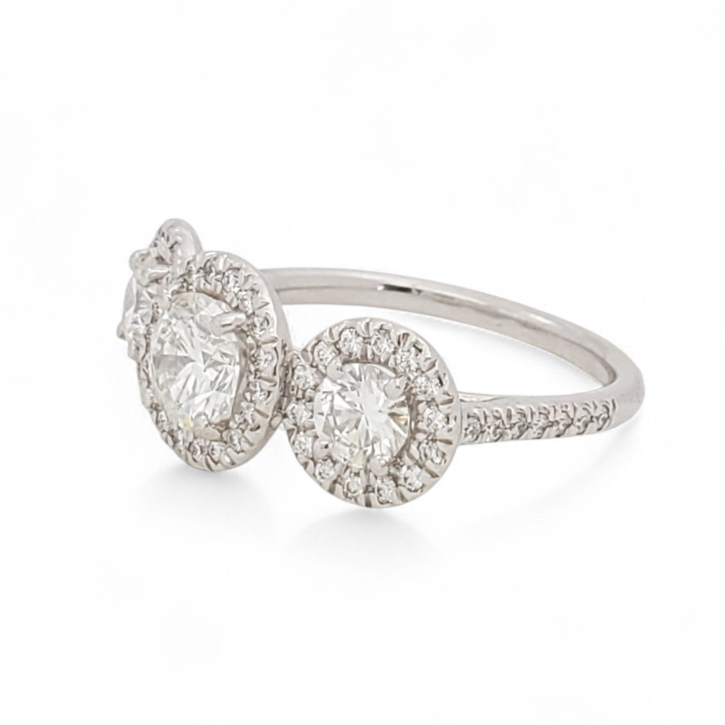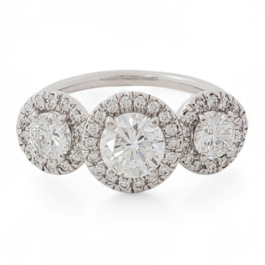 PAVE 3 STONE - 18KT WHITE GOLD MICRO PAVE THREE STONE RING WITH 1.75CT TW ROUND BRILLIANT DIAMONDS, H COLOR, SI1 CLARITY CENTER APPRX 0.75 WITH TWO APPROX. .50 SIDES.
