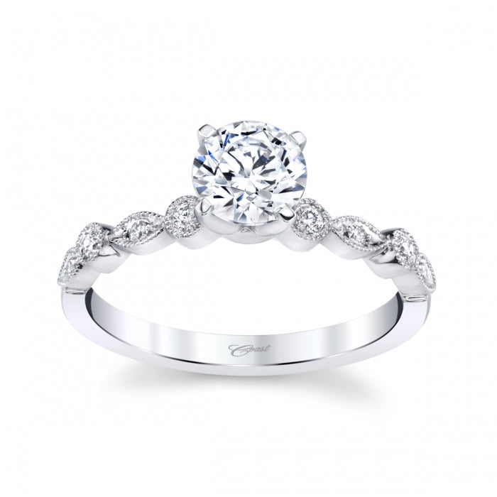 Diamond semi-mount in 14 karat white gold featuring 0.09 carat total weight of round brilliant diamonds set in alternating round and marquise motifs with milgrain edging. The 4 prong center is designed for a 0.75 carat center stone. By Coast Diamond. *CZ center, desired center stone sold separately.