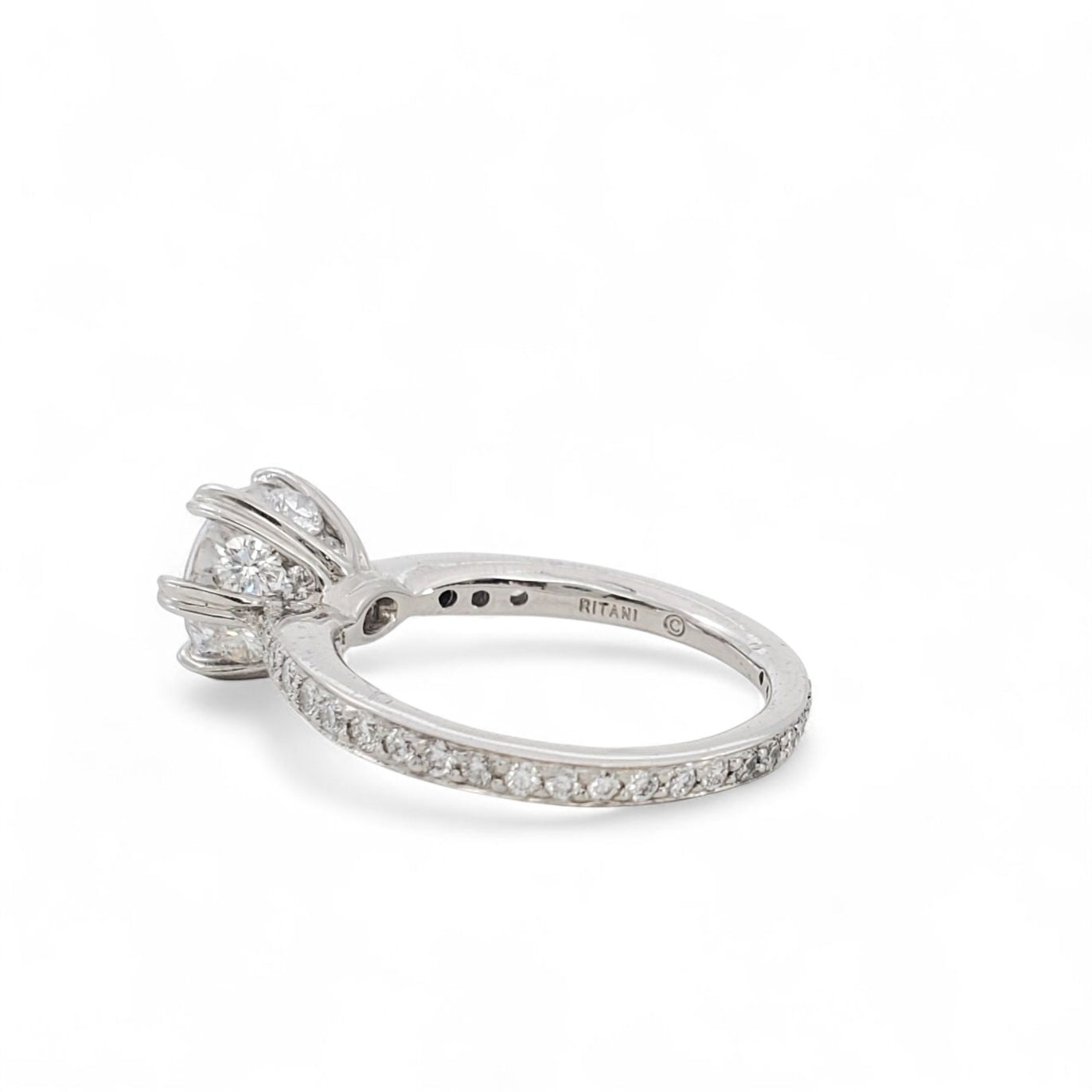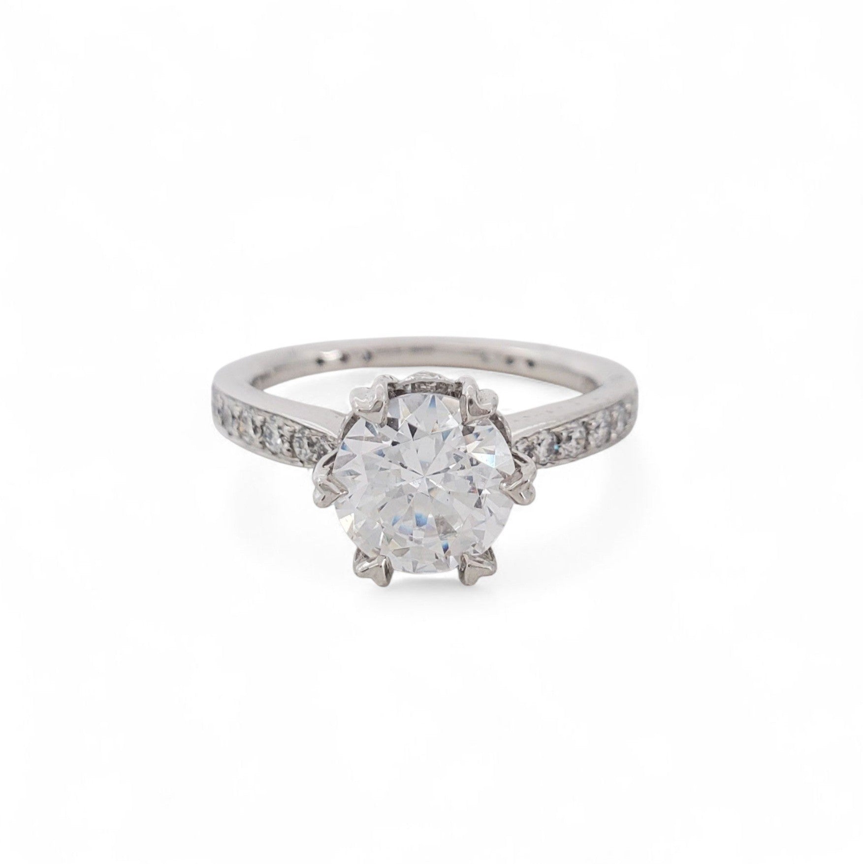 Platinum semi mount features a dazzling array of .93 carats total weight of round brilliant accent diamonds. Crafted to accomodate a 1.50 carat center stone. Center stone not included and sold seperately.