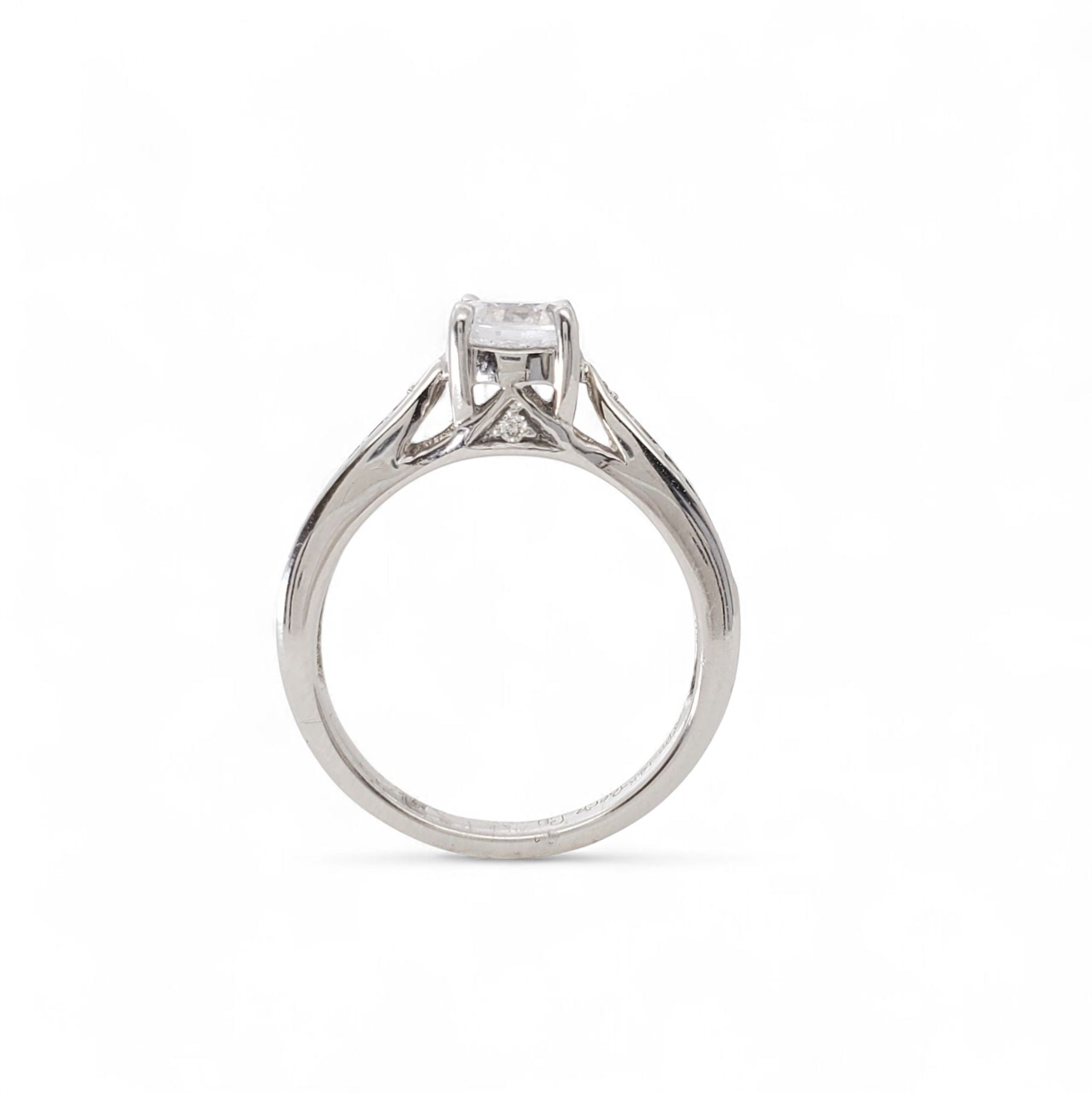 Cathedral-style semi-mount in 14 karat white gold featuring round brilliant cut accent diamonds, totaling 0.14 carat weight, bead-set along the tapered shoulders and one on either side of the four-prong center setting. *CZ center, desired center stone sold separately.