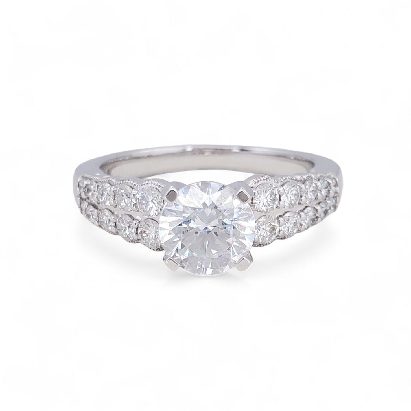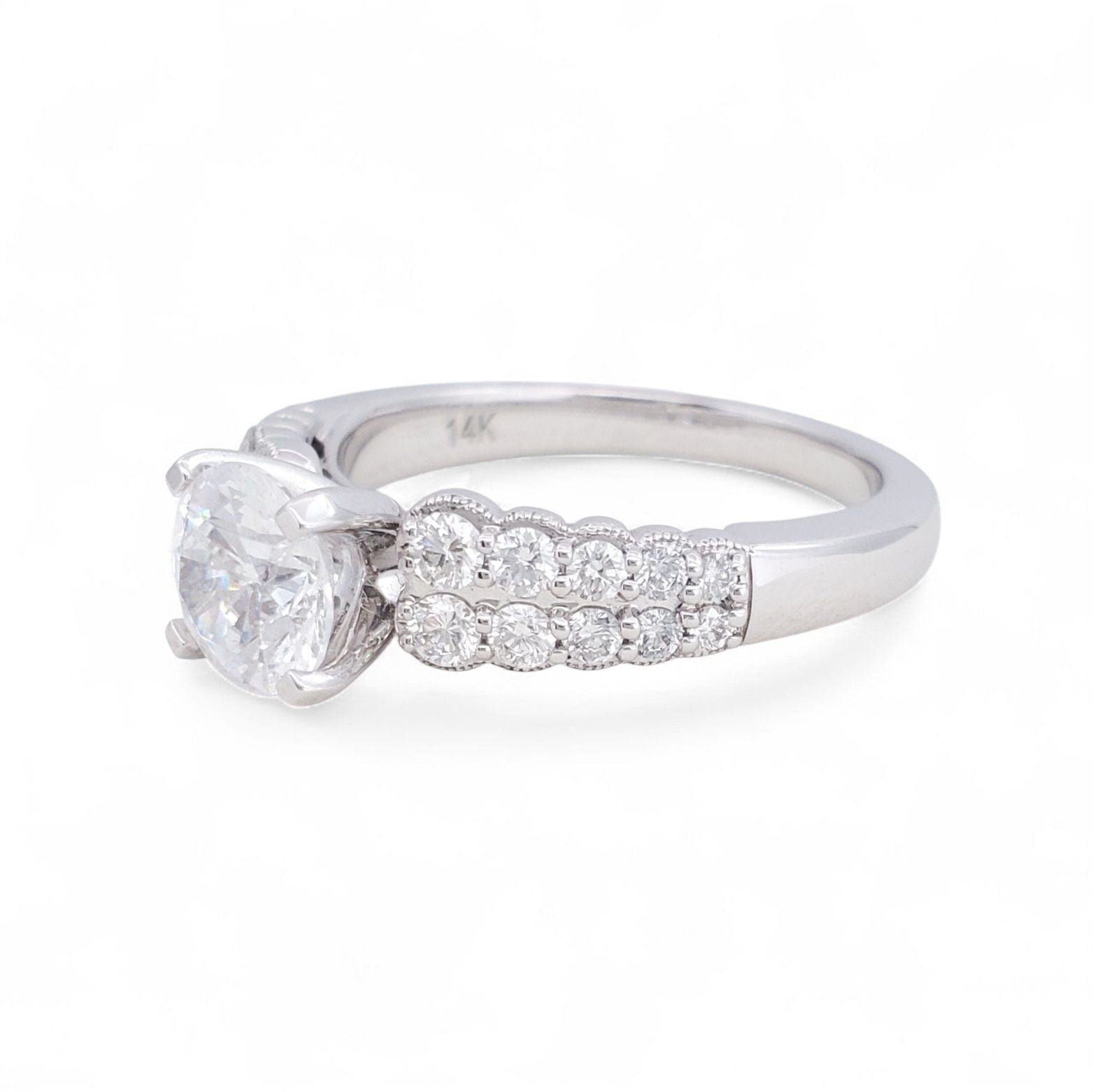 Diamond semi-mount in 14 karat white gold with two rows of round brilliant accent stones on the shoulders totaling 0.43 carat total weight by Coast Diamond. *CZ center, desired center stone sold separately.