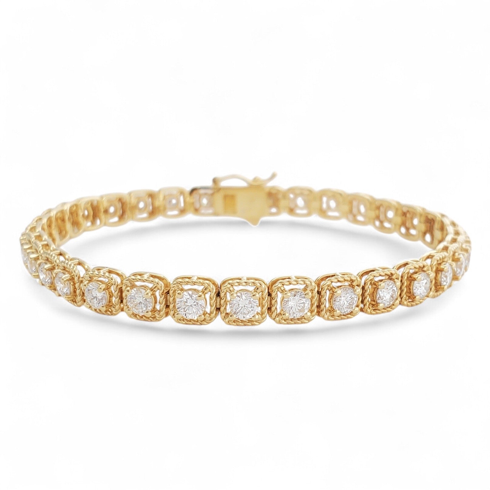 DIAMOND BRACELET WEIGHING 3.90 CTW WITH 34 ROUND DIAMONDS SET IN A 18K YELLOW GOLD SQUARE MOUNTING WITH MILGRAIN 7 INCHES IN LENGTH