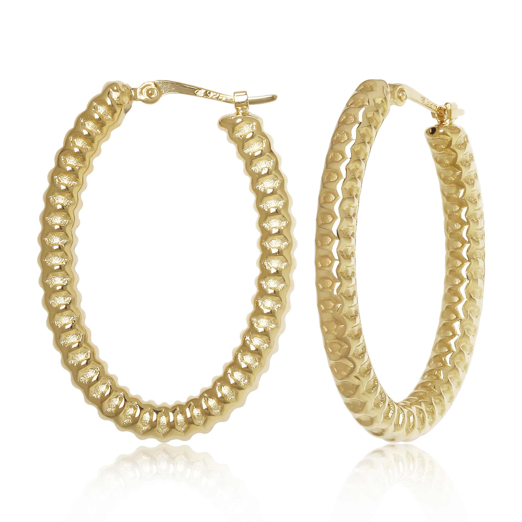 Honeycomb textured oval tube hoop earrings [1.17 x 0.82 inches] in 14 karat yellow gold with snap down wire closures by Carla Corp.