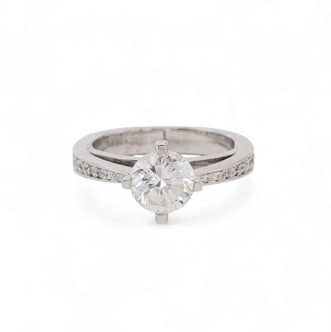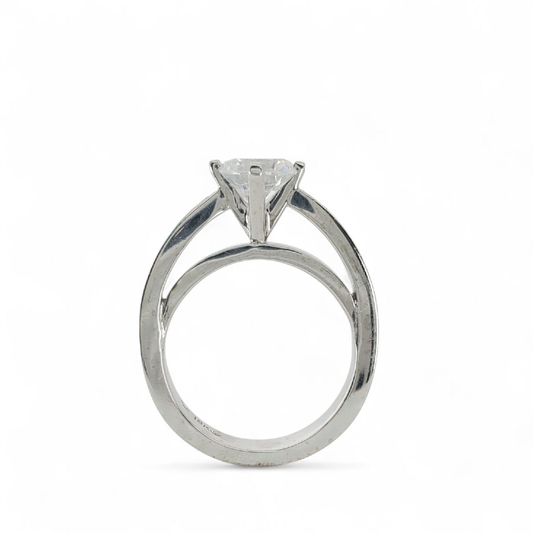 Modern cathedral-style diamond semi-mount in polished 18 karat white gold featuring tapered round brilliant accent diamonds bead-set down the shank on either side of the center compass setting. *CZ center, desired center stone sold separately.