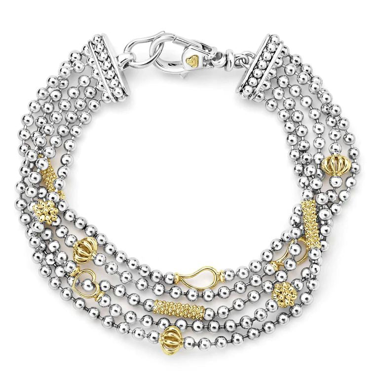 5 STRAND BRACELET WITH A 2.5MM CAVIAR ICON BEADING AND 18K YELLOW GOLD BARS, 5MM BALLS, & SHELL IN EACH ROW. IN STERLING SILVER & 18K YYELLOW GOLD SIZE 7 BY LAGOS
