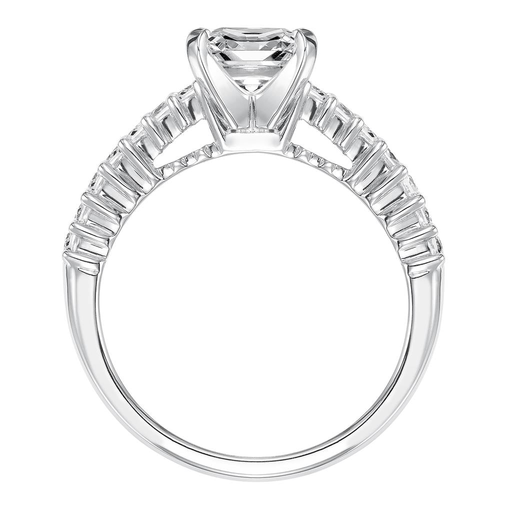 Princess cut diamond semi mount with .33 ctw of Princess cut diamonds on either side of shank. set in 14k white gold. The center holds a 1 ctw. princess cut stone. *Customizable in size, gold karat and tone.