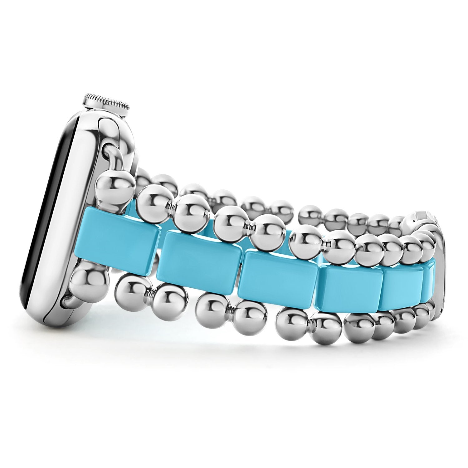 The LAGOS Smart Caviar Bracelet in striking blue ceramic. Designed for Apple Watch, this bracelet features signature Caviar beading crafted from polished stainless steel and light blue links, from the Smart Caviar Collection.