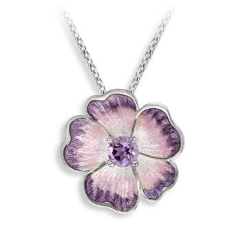 Sterling silver flower pendant with purple enameled petals and a round-cut amethyst center suspended from an adjustable 20 inch rolo chain. By Nicole Barr.