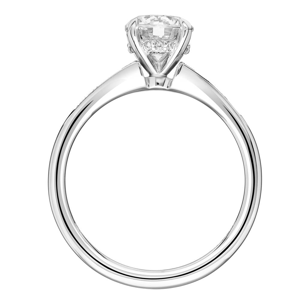 Accented solitaire semi-mount by Frederick Goldman featuring tapered round diamonds, totaling 0.17 carat, bead-set across the shoulders of its high-polished 14 karat white gold shank. *CZ center for display only, desired center stone sold separately.