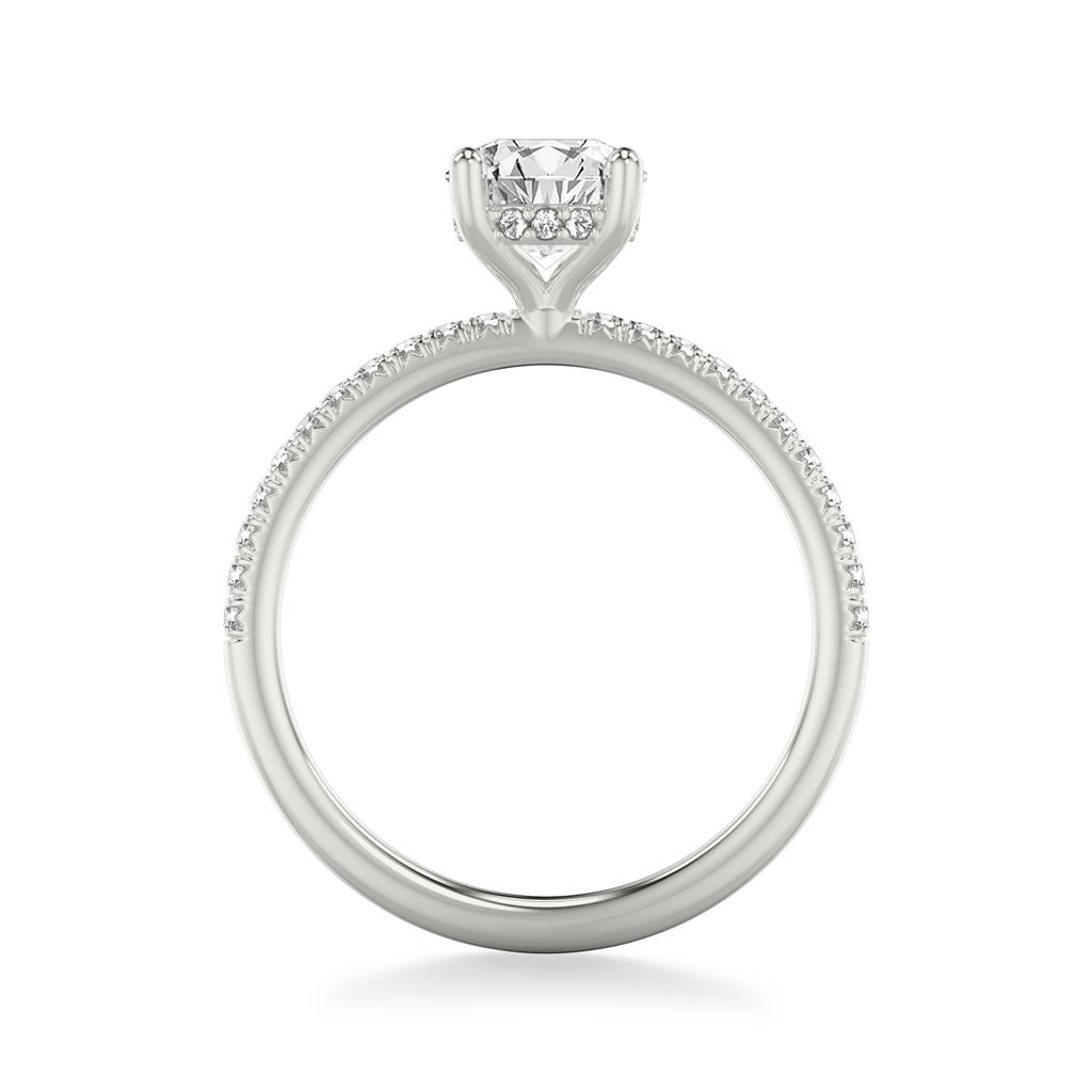 14 karat white gold semi-mount featuring 0.20 carat total weight of round diamonds set down the shank and in a hidden halo around the four-prong center setting designed to fit a 1 carat round center stone. By Frederick Goldman. *CZ center for display only, desired center stone sold separately.