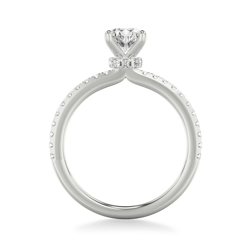 Accented solitaire semi-mount in polished 14 karat white gold featuring 0.29 carat total weight of round diamonds set down the shank and in a collar around the base of the four-prong center setting designed to fit a 1 carat oval-shape center stone. By Frederick Goldman. * CZ center for display only, desired center stone sold separately.