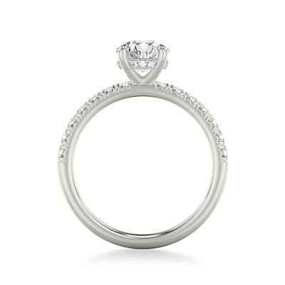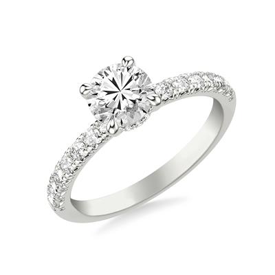 Solitaire semi-mount in 14 karat white gold with round diamonds, totaling 0.50 carat, set down the shank and in a hidden halo around the four-prong center setting. By Frederick Goldman. *CZ center for display only, desired center stone sold separately.